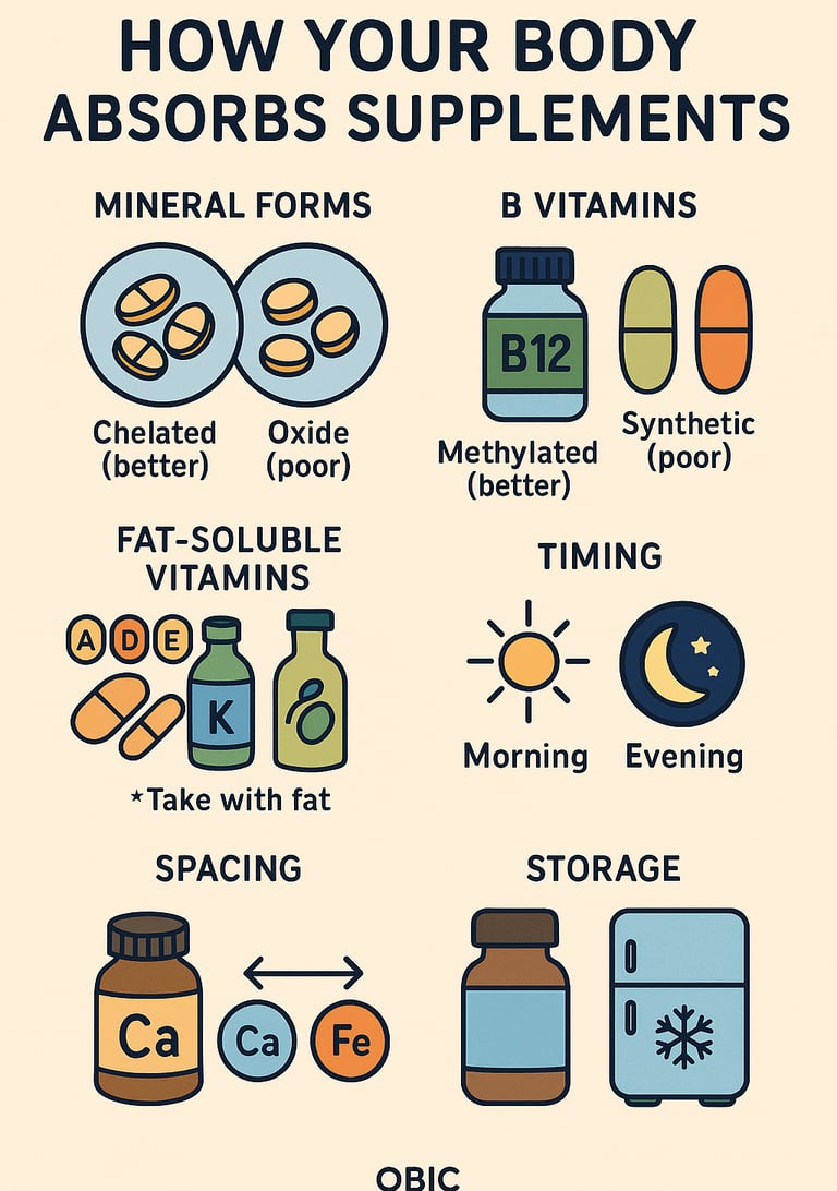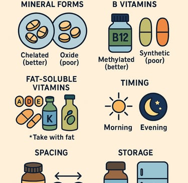 Key Takeaways • Chelated > oxide • Methylated B vitamins absorb better • Fat‑soluble vitamins need fat • Timing and spacing matter • Quality and storage protect potency